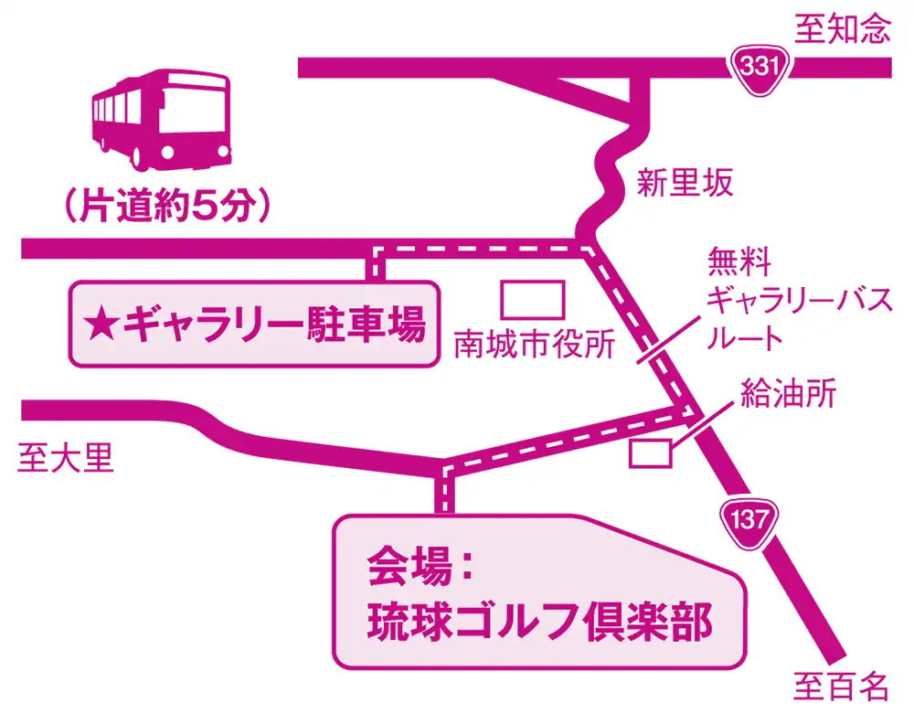 沿道主要ポイントに道路案内プレートを設置してあります。大会期間中、ギャラリー駐車場を特設しています。南城市公共駐車場をご利用ください。