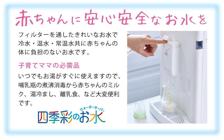 子育てお母様必見、四季彩から月額税込1,690円のウォーターサーバーが出ました!会場では試飲コーナーあり、また当日お申込みで、ウォーターサーバー使用料金4ヶ月無料キャンペーンもあります。この機会に是非、便利で安心で安い四季彩のお水を。