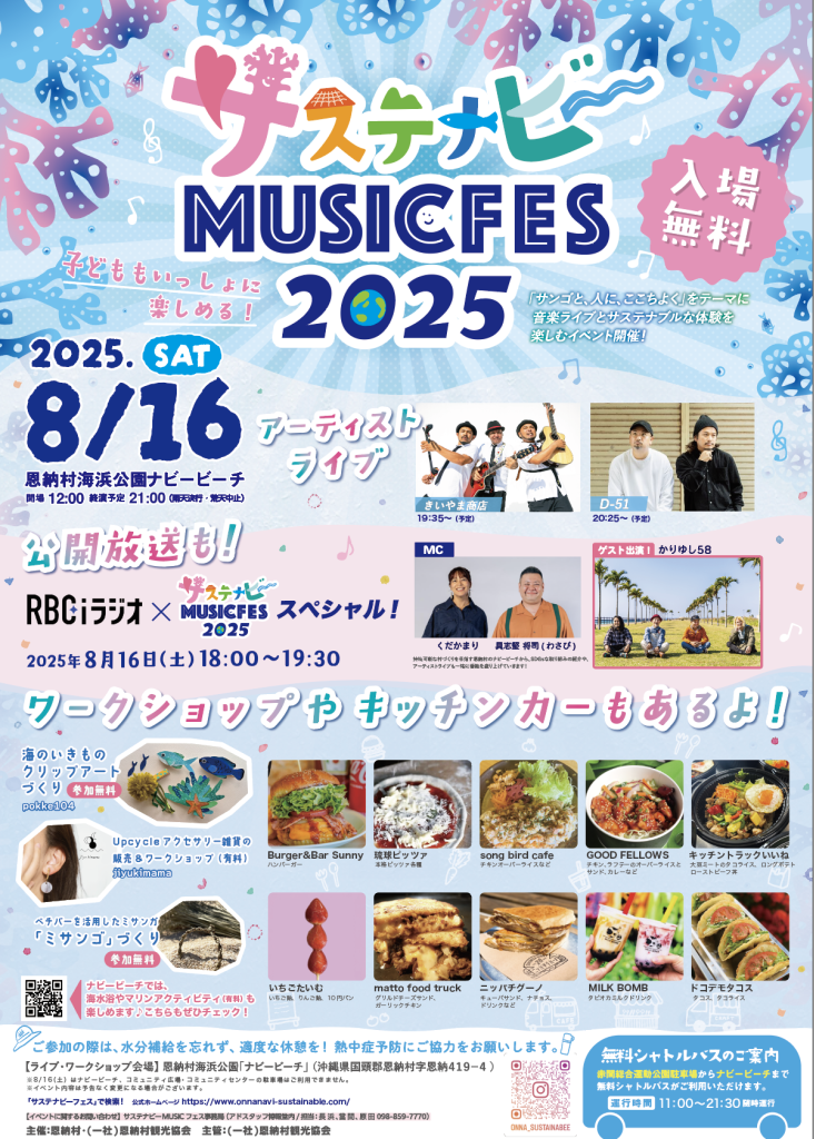 またイベント会場ではワークショップやキッチンカーも用意され、「サンゴと、人に、ここちよく」をテーマにラジオの公開生放送や、音楽ライブとサステナブルな体験を楽しむイベントとして開催されます!