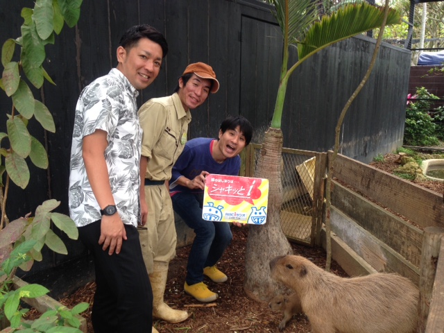 今朝の知念だラジオカーは、東南植物楽園で今月産まれたばかりのカピバラの赤ちゃんに会ってきました。 世界最大のネズミと言われるカピバラ。 東南植物楽園にいるオスのカピバラ『ジール』と メスのカピバラ『レタス』の間に4月8日に赤ちゃんが産まれました。 まだ性別がわからない為、名前はつけられていませんが お母さんに甘えてずっとくっついている赤ちゃんカピバラはとても愛らしかったです。 ラジオなので出来ればカピバラの鳴き声を届けたい!・・・と思ったのですがタイミング良く鳴いてくれず。 代わりに飼育係の玉城さんに鳴き真似をしてもらいました。 東南植物楽園ではゴールデンウィークも色々とイベントがありますので ぜひカピバラ家族にも会いに来てください!