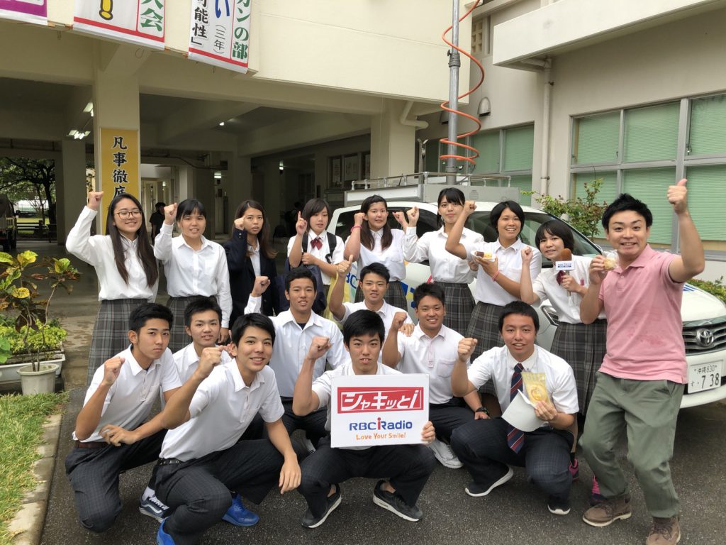 浦添商業高校の神谷教頭が素晴らしくて、わざわざスタジオにも商品を届けて下さったので、二元中継ができました。浦商の皆さん非常に協力的でした。気持ちの良い学び舎です!