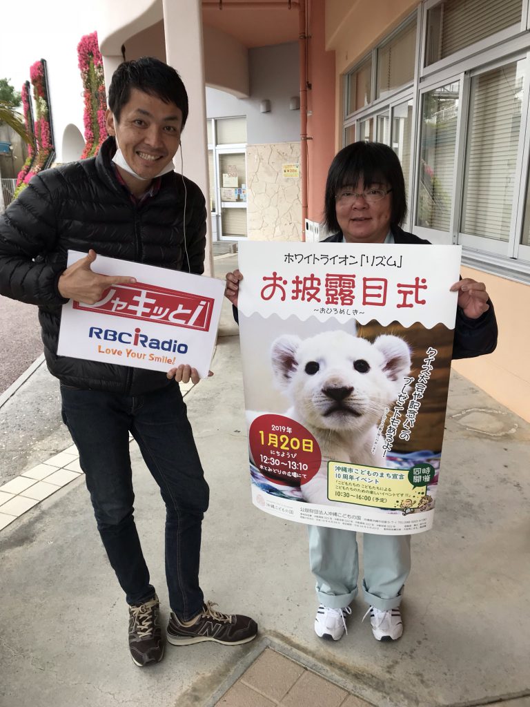 おはようございます! 雨の木曜日。沖縄で15度をきると、白い息が出ないかと試したくなります儀保です。 今朝は日本最南端の動物園「沖縄子どもの国」に行ってきました。 年間、約50万人が訪れる子どもの国に勤めて31年の大宜味こずえさんに動物達の見方、 楽しみ方を教えていただきました。 平成29年にホワイトライオンのセラムがやってきて3月で早2年。 動物総選挙で1位、リーフレットのセンターを飾るセラムの将来のお嫁さん!リズムがやってくるんです! 復興支援で、ラオスから東北サファリパークにきた二頭の像。そんなゾウ達も越冬の為、 3月までここ沖縄で過ごします。様々なご縁が繋がり、ホワイトライオンのセラムとリズムが寄贈され、 いよいよお披露目となります。そんなリズムが1/20(日)12:30~13:10の間お披露目!(水と緑の広場にて) リズムは現在5ヶ月。大宜味さんの話しでは、リズムは"おてんば娘"らしいとの情報が入っているそうです。 当日はピンク色の肉球にも注目してほしいとのこと。また、東北サファリパークの飼育員さんも来るので、 大事に飼育された思いの引き継ぎもあると思います。