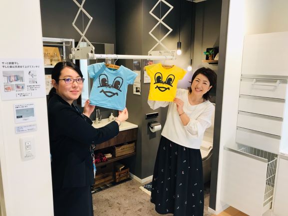 (左)パナソニックリビングショウルーム沖縄 アドバイザー 内田礼子さん (右)MC 島袋千恵美 パナソニックの人気伝統商品! 「室内物干しユニット ホシ姫サマ」 使うときだけ竿を降ろして室内干し 洗面室からリビングまで設置できます。 長〜い沖縄の梅雨時期にも大助かり〜♪