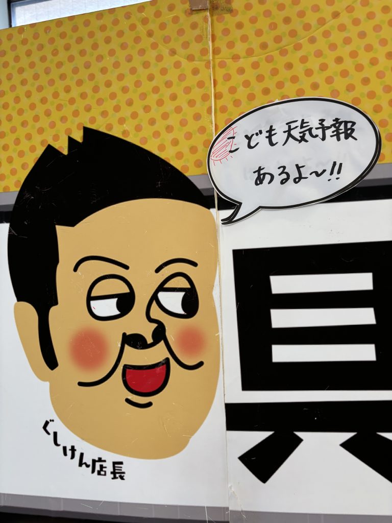 答え: 「看板の店長に「子供天気予報あるよ~!!」と書かれた吹き出しが貼られている 」