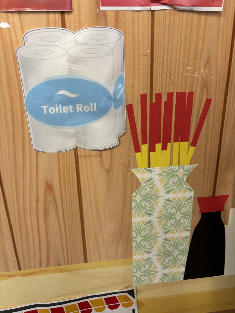答え: 「りほさんの後ろにトイレットペーパーのイラストが貼られている 」