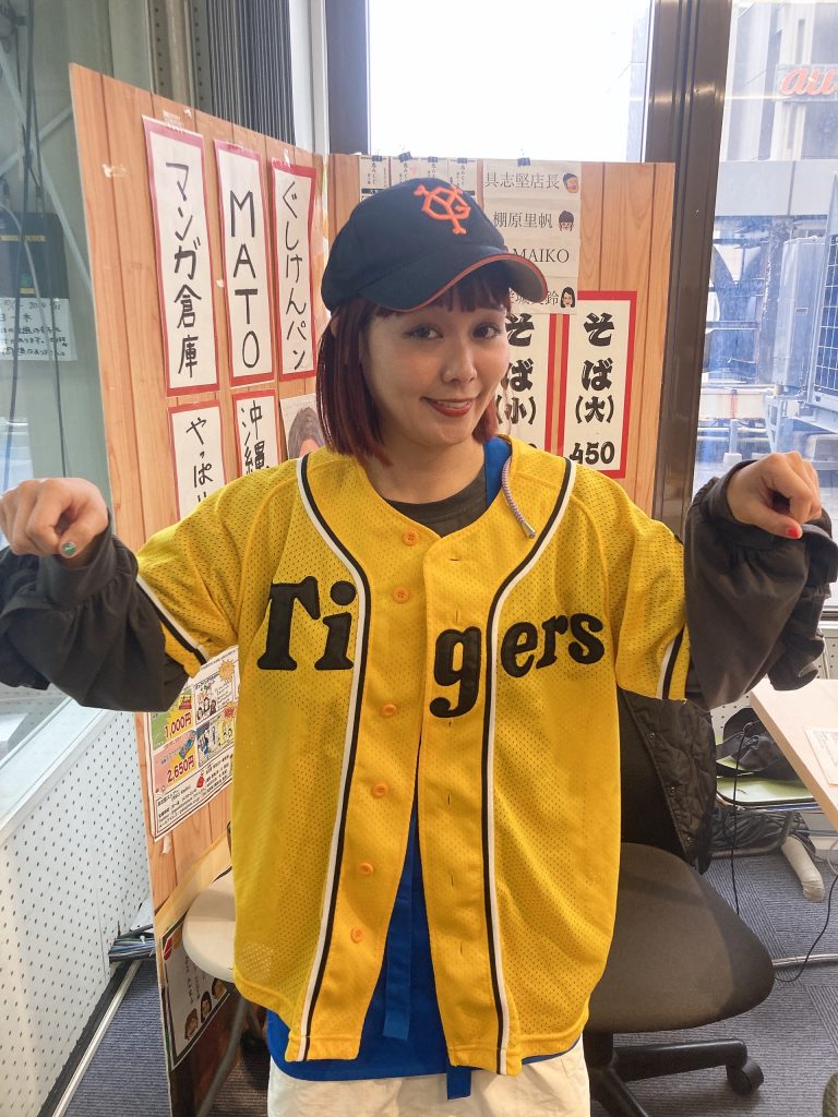 答え: 「MAIKOさんが巨人のキャップと阪神のユニフォームを着ている 」
