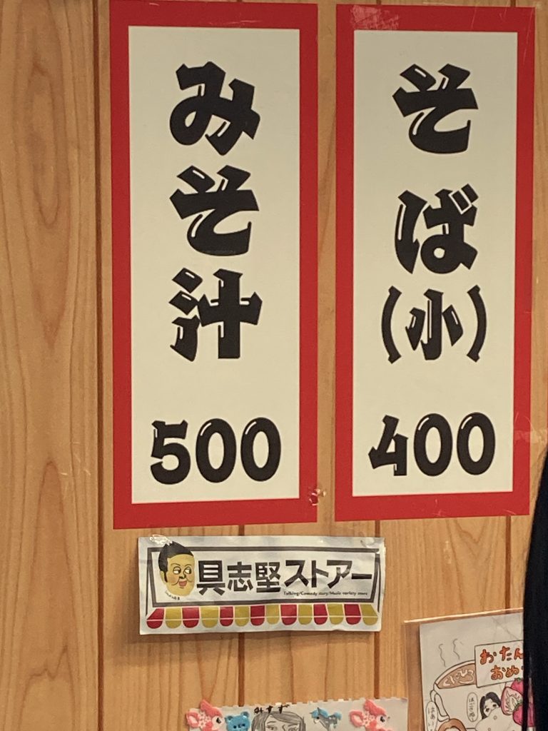 答え: 「みそ汁500円の下に具志堅ストアーのロゴが貼られている 」