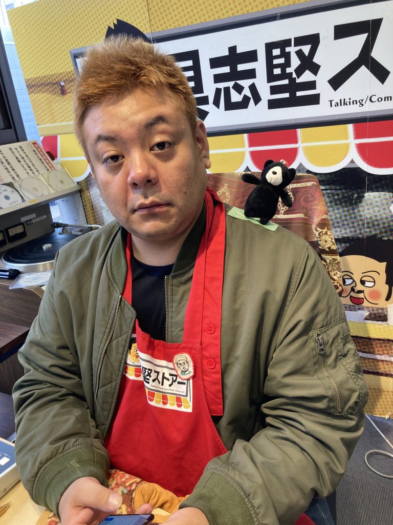 答え: 「店長の肩にクマのぬいぐるみがのっている」