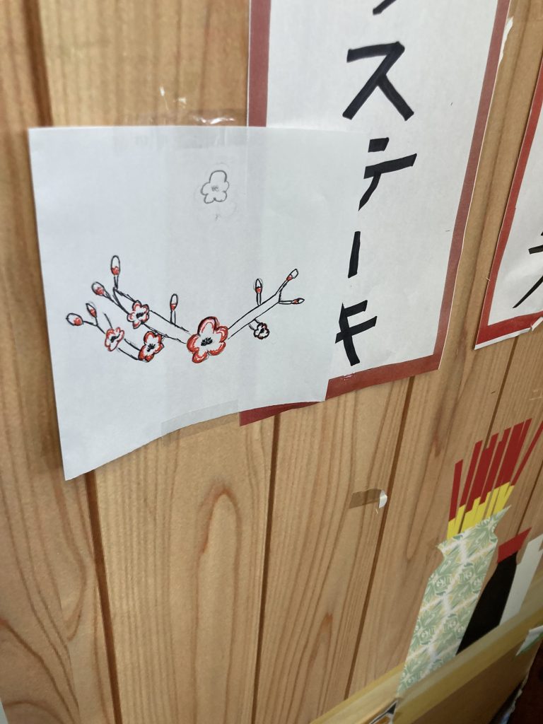 答え: 「美鈴さんの後ろに梅の花のイラストが貼られている」