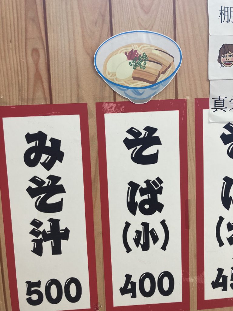答え: 「メニューのそば(小)の上に沖縄そばのイラストが貼られている 」
