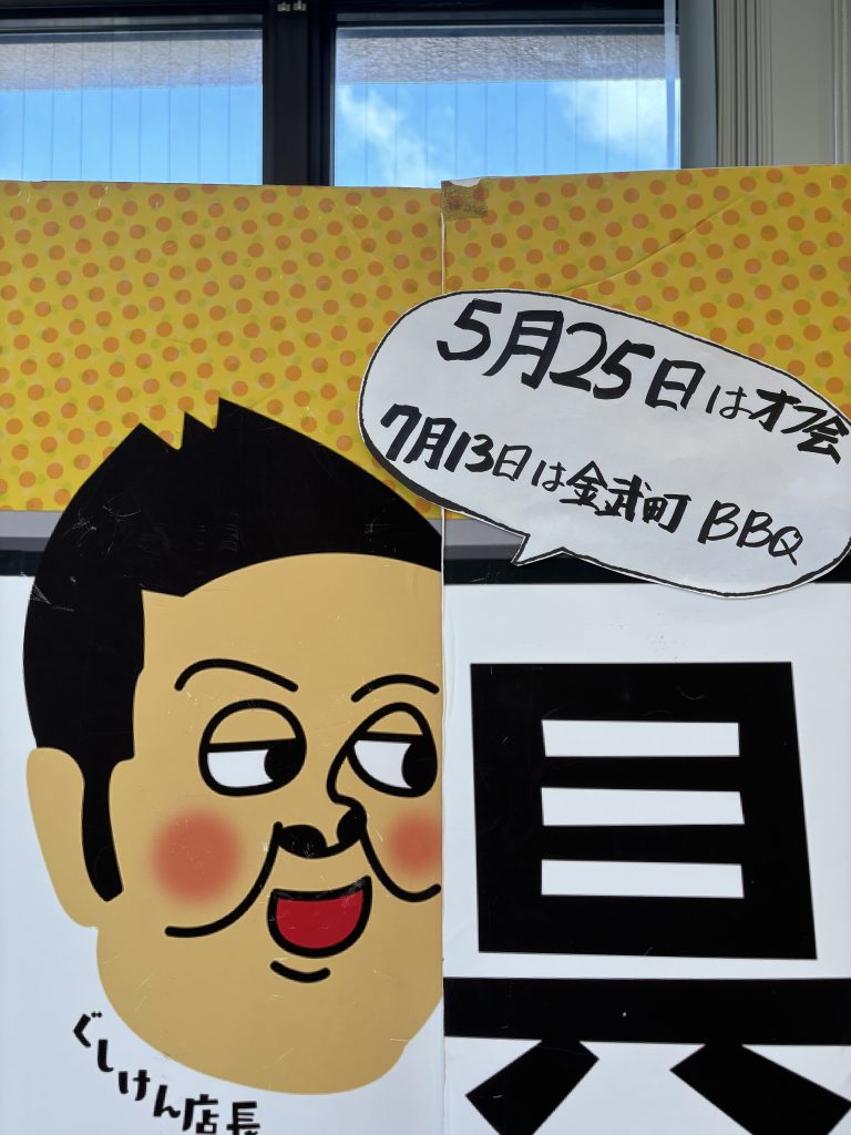 答え: 「店長の後ろの看板に「5月25日はオフ会、7月13日は金武町BBQ」と書かれている」