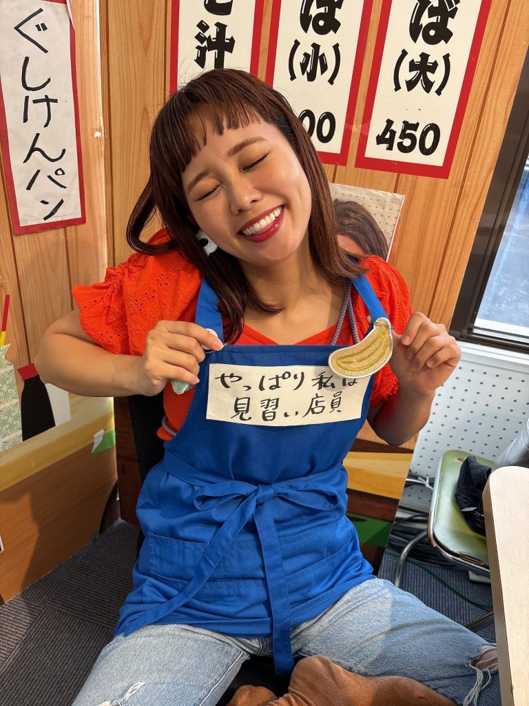 答え: 「マイコさんのエプロンにやっぱり私は見習い店員と書かれた紙が貼られている」