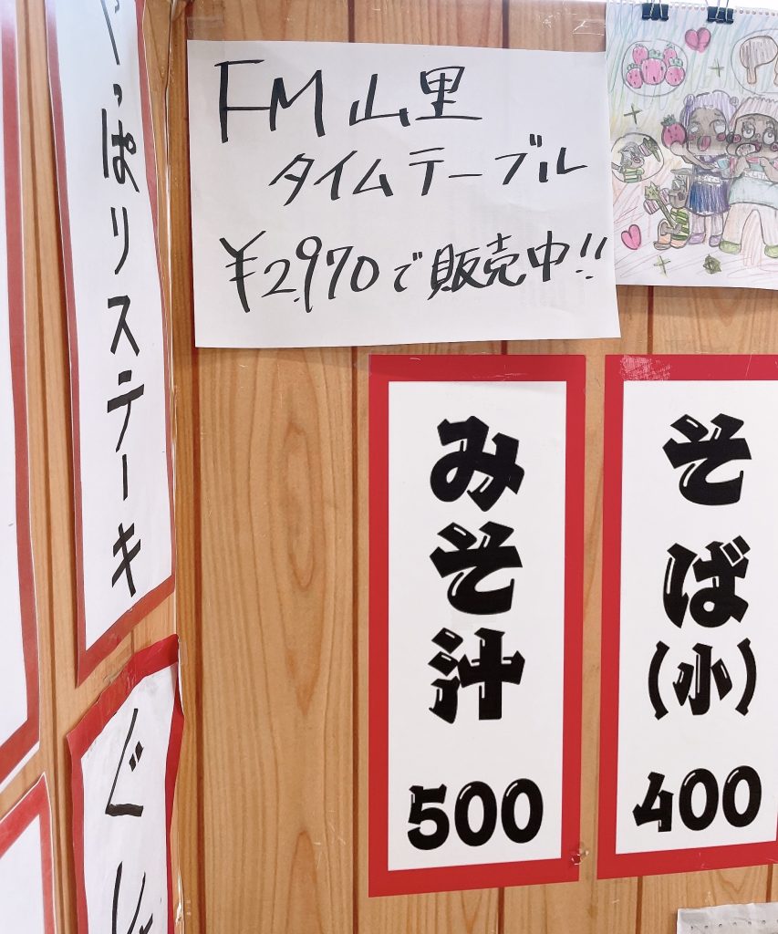 答え: 「後ろの看板に「 FM山里タイムテーブル ¥2970で販売中!! 」とかかれている。」