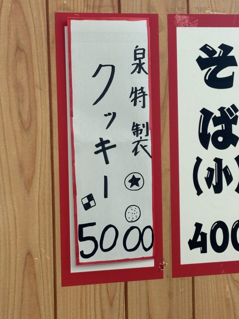 答え: 「メニューに泉特製クッキー5000円と書かれた紙が貼られている」