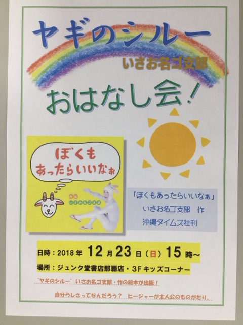お話:ジュンク堂書店那覇店店長:森本浩平店長と「やぎのシル―」こと いさお名ゴ支部さん