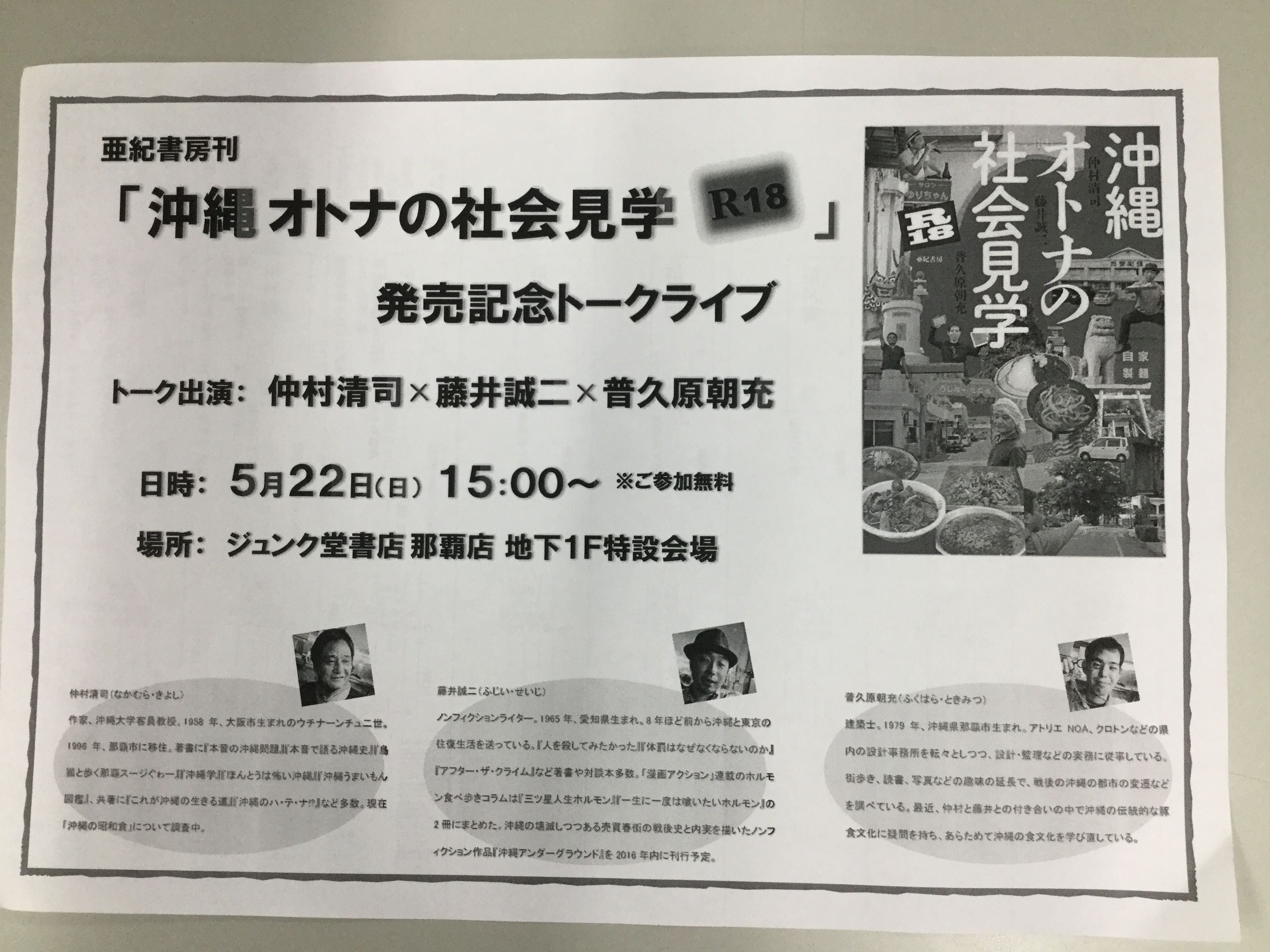 お話:ジュンク堂書店那覇店店長:森本浩平店長(右)、作家の仲村清司さん(中央)、ノンフィクションライターの藤井誠二さん(左)