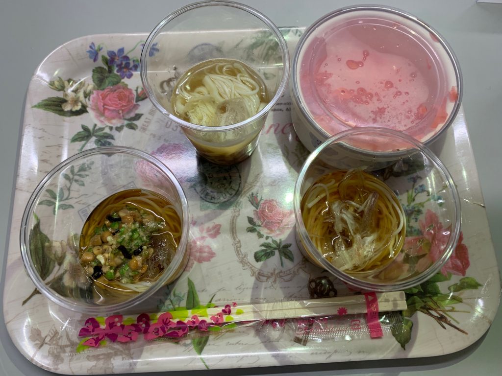 左から、納豆おくら塩昆布、冷やし沖縄そば、みょうが柚子胡椒。