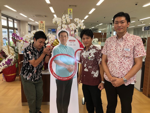 ヤンバルは本部にやって来ました! 沖縄銀行本部支店が、渡久地から大浜に移転オープン!バリアフリーな作り、 マッサージチェアを置くなど快適な計らいがなされています。 来たお客様にはアセロラフローズンを振る舞い、 さらには商品契約で500円のQUOカードもプレゼントです。 また行員の方がみんな良い人!楽しく業務をしているのが伝わって来ます。 地域と共に歩んで来た沖縄銀行本部支店はこれからもグイグイ本部を支えて行きます! 身長187cmの高江洲さん、魔裟斗似の渡具知さん、山城頭取、ありがとうございましたー!