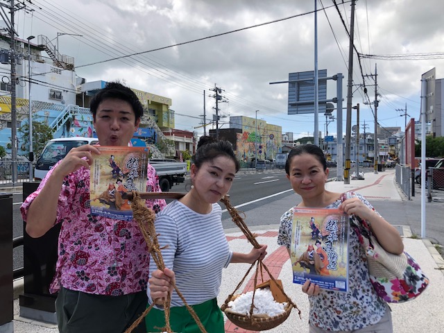 コザ十字路、銀天街入口にダーっと広がるカラフルな壁画。 ここに描かれている越来鞍司とその娘、真鶴姫をモチーフにした新作組踊が上演されます。 覇権争いを避け、平和を望んでいたのちの尚泰九である越来鞍司。 その普遍的な願いである平和をテーマにした組踊です。 本番が近付き稽古も熱が入るところ。 出演者の吉田さんは普段の話し言葉でもウチナーグチが出るくらいに役を入れ込んでいるそうです! 「越来真鶴姫」 沖県芸琉球芸能専攻OB会 【日程】2018.9.9(日)14時上演 【場所】タイムスホール 【料金】前売3000円 当日3500 学生2000円 【問合】098-860-3588(沖縄タイムス社読者局文化事業本部) 脚本の喜屋武さん、出演者でマース売りの吉田さん、ありがとうございましたー!