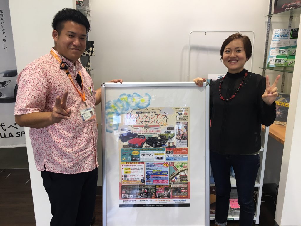 皆さんこんにちは☆ ラジオカーは、浦添市城間「トヨタカローラ沖縄 浦添店」におじゃましました! オレンジの看板が目印ですね(≧∀≦) 「2018オールトヨタ秋のフルラインアップフェスティバル」 10/6(土)7(日)開催! 会場:沖縄コンベンションセンター 昔なつかしい車の展示や、キッズエンジニア体験ができるキッズコーナー、更に二日間のみのご成約特典もあります。 お客様駐車場は500台以上ありますので安心ですね★ ※10/6(土)は、台風の影響で開催時間変更の可能性があります、今後の情報にお気をつけください。