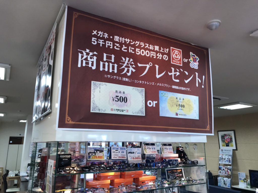 メガネ・度付きサングラスお買い上げ5,000円事に500円分のサンエーor OCS商品券がもらえます(*´꒳`*)