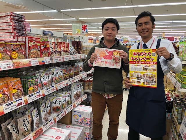 コンビーフハッシュとかさ、家に常備されてるさ?これはもう今日が買いです! 69円です。3ケースまで買って良いそうです。 そして、オキハムの対象商品を1点でも含んだ1000円以上のレシートを ハガキに貼って投函するだけで、【A賞】ルネッサンスリゾートオキナワのディナーペアチケット 【B賞】サンエー商品券2000円分が当たるチャンス。 ダブルチャンスでもオキハム商品1000円分がもらえる可能性も残っています。 ただ買い物をするではない! 買ったあとの1ヶ月後にプレゼントが当たるチャンスを待ちわびる喜び。 これはプラスアルファの楽しみを与えてくれる質の良い買い物です! 今月は大感謝祭開催中のサンエーがおすすめ!つかざんシティの一般食品担当の山城さん、 ありがとうございました!