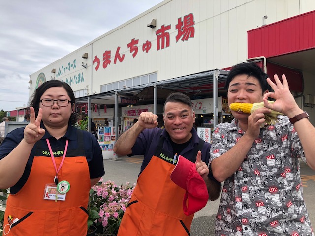 日本全国のJAファーマーズの中でも屈指の賑わいを見せる、糸満うまんちゅ市場よりお届け! ゴールデンウィークの最終日、焼きとうもろこしや野菜串、果物串などを販売し、縁日と銘打ってまるでお祭りのようです。 さらに明後日5/8はゴーヤーの日! ということで「良いゴーヤー」にちなみ、11:58から1本58円で売るというお得&こだわりっぷり! 野菜ソムリエ監修のゴーヤー料理の試食もあります。 鮮度抜群・糖度満点のとうもろこしでした。ありがとう土の恵み。 威勢の良い仲門さん、伊敷さん、ありがとうございましたー!