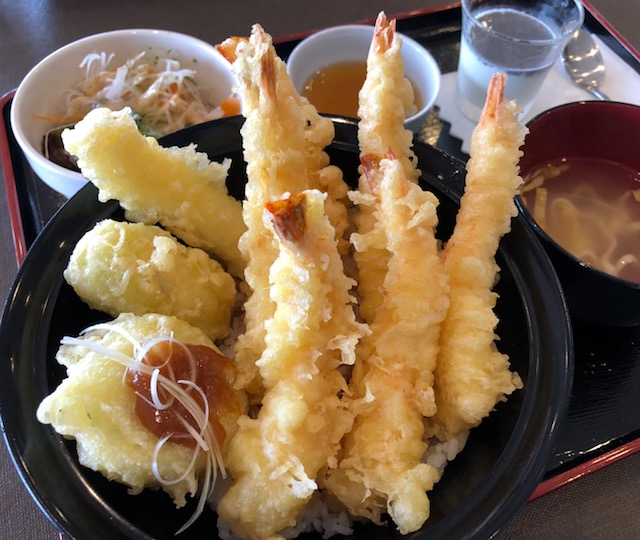 天久テラスのランチが輪をかけて大ブレイク中! その秘密は1000円(特典利用時)で食べられるパフォーマンス抜群の内容。 定番の天山も人気ですが、今日は「束ね海老天丼」を頂きました。 海老天が6本入った、夢達成の一品です。リポートでの音、聞いてもらえましたか? 「サクッ!」という脳を揺さぶるサウンド、堪らんかったでしょう。 にんにくが効いた名物キャベツの天ぷら、甘味噌で食べるヘチマの天ぷらも美味〜でございました。 オーナーの、天ぷら伝道師・ザビエル中村さんは「銀座で食べたら間違いなく3000円! これをみんなに知ってもらわないと県民の損失になる!」と力強く仰っていました! 「RBCiラジオを聴いた」で、6月一杯1000円で頂けます! サラダもデザートもコーヒー飲み放題が付いてこれ。泣けます。 海も見られて大型駐車場も完備。反射的にGOでしょう!