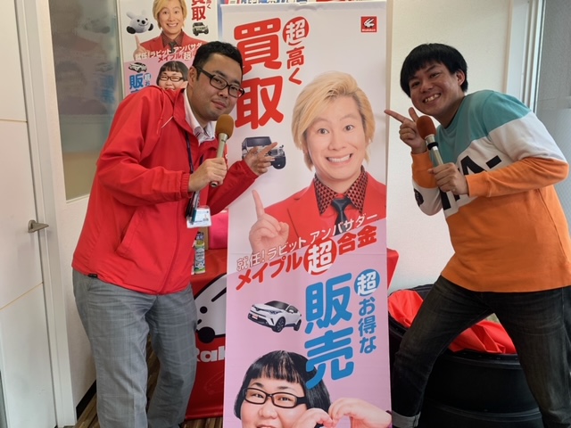 天久 国際通り沿い 赤い看板とメイプル超合金さんののぼりが目印の ラビット 那覇新都心店からラジオカー! 公式LINEお友達追加で抽選でステーキハウス88の1,000円分のクーポンプレゼント♪ また、1/31(土)からの全国キャンペーン『この買取価格、嬉しいぞ!キャンペーン』ではご成約者の方抽選で100名様に豪華商品プレゼント! また各店舗ご来店の方にはオリジナルグッズもプレゼント!! 098-861-0031まで!