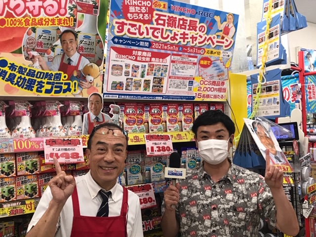 ただ今キンチョー×ビッグワンのタイアップ「石嶺店長のすごいでしょキャンペーン」を開催中! キンチョー商品を含む1000円以上お買い上げのレシートをハガキに貼り付けorRBCアプリからの 応募で、オークス商品券2000円分が当たるチャンス! 店長おすすめは「ゴキブリムエンダー」無煙と無縁が掛かってるんだぜこれ!すごいでしょー! 空間に向けて数回プッシュするだけ。煙じゃないので、準備不要で家の外に出る必要もありま せん。すご! キャンペーンはビッグワン全店で開催中です!![]()