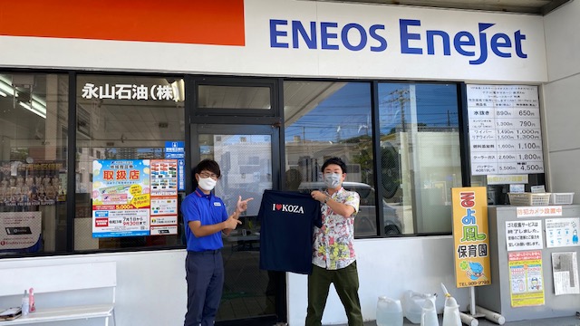 ラジオカーは、沖縄市高原の永山石油高原SSより。好天に恵まれています。 「琉球ゴールデンキングスグッズ当たるキャンペーン」 泡グラスコート洗車3回or泡コート洗車6回で、 写真に写っているキングスTシャツを必ずプレゼント! さらにWチャンスとして選手の直筆サイン入りのグッズ(ユニフォーム等)が当たります! 数に限りがあります。急いで! 「50周年記念 現金10万円当たるキャンペーン」 2万円分の給油で最高現金10万円が5名に当たる意味不明キャンペーンです! 他にも1万円分商品券が50名など、合計2,555名に何かしら当たります。 もれなくBOXティッシュプレゼントっ。 今日はこの2つのお得なキャンペーンのご紹介でした。永山石油の兼城さん、ありがとうございました!