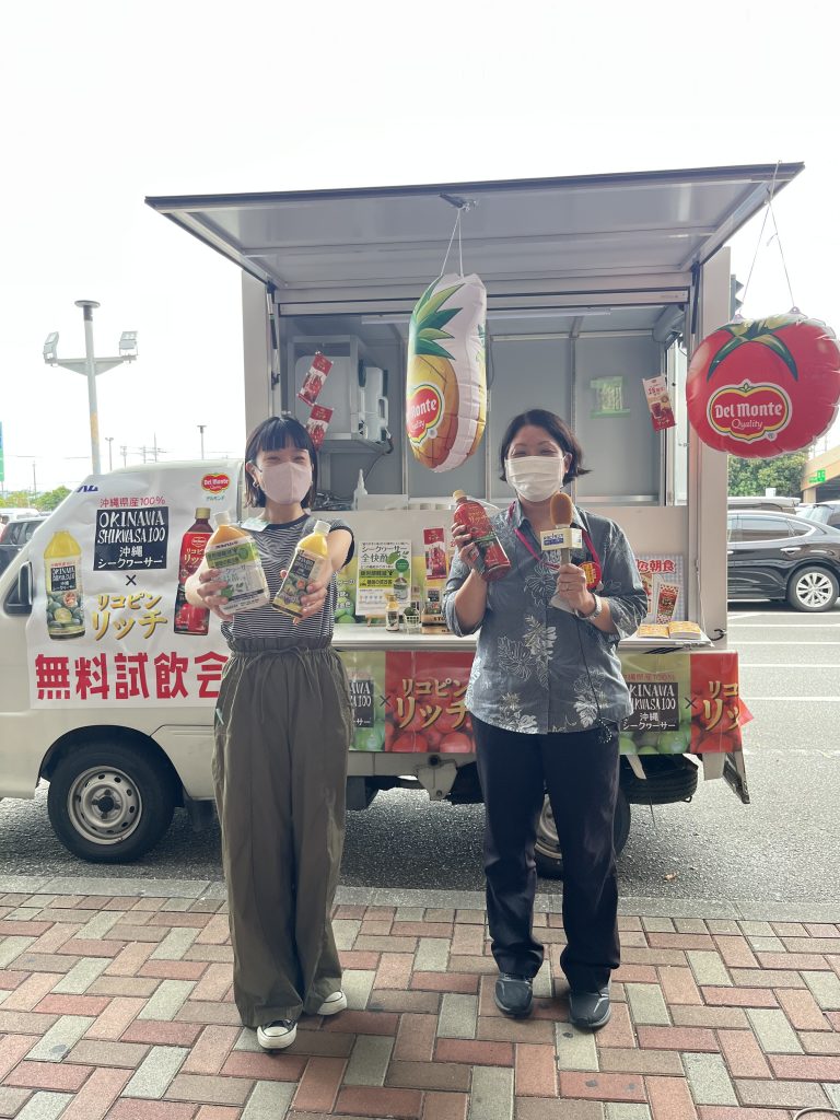 イオン具志川店では「デルモンテ:リコピンリッチ」とオキハムの「沖縄シークヮサー」と「シークヮサー全快酢」の試飲を提供!