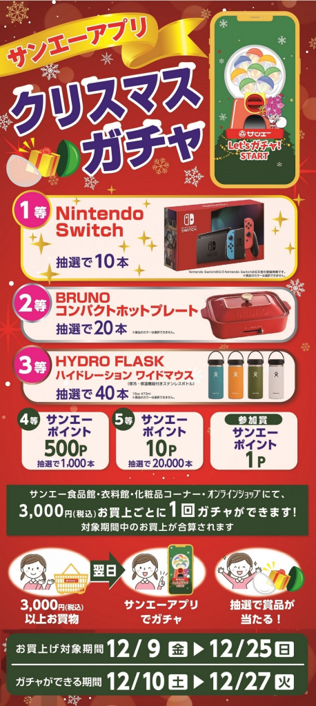 サンエーアプリでクリスマスガチャ🎄3,000円お買い上げ毎にガチャ1回!🥇1等はNintendo Switch