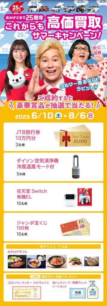現在開催中!8/6(日)まで北谷店、ラビット那覇新都心店でお車のご成約されたお客様に抽選で豪華賞品が当たる🎯