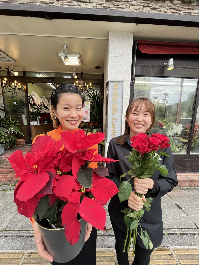 クリスマスの時期は赤いバラ花束やポインセチアをお買い求めの方が多いそうですよ🎄