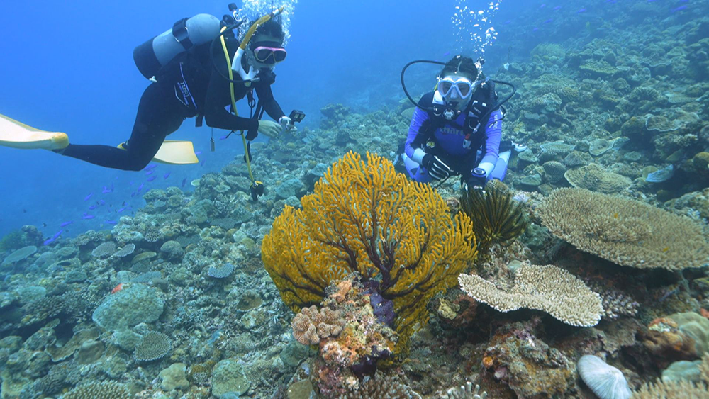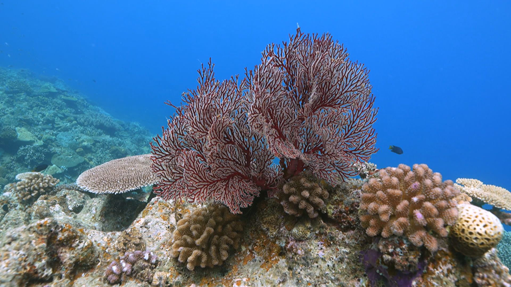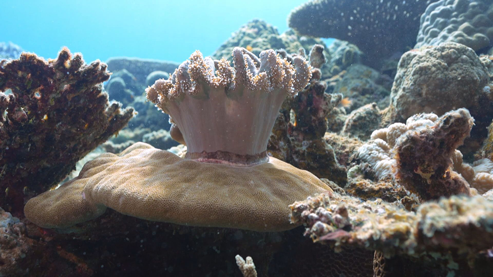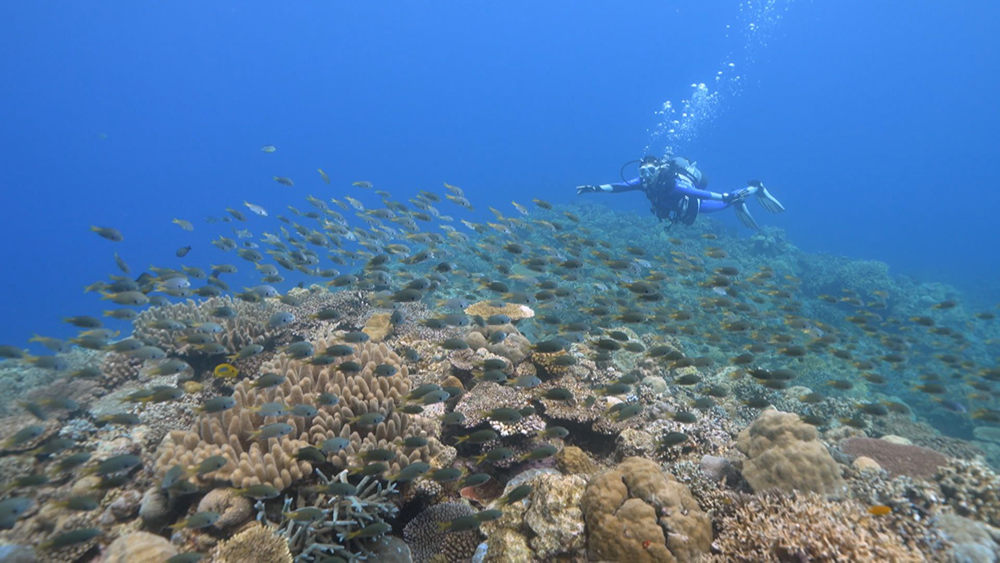 海に潜ってみると、そこにはサンゴ研究者の真央さんでもお目にかかれなかった珍しい黄色のイソバナや2種類のサンゴが合体しながら成長する個性豊かなサンゴたちの姿が!多くの種類のサンゴがこれだけ残っている光景を目の当たりにした澪花ちゃんは大興奮!