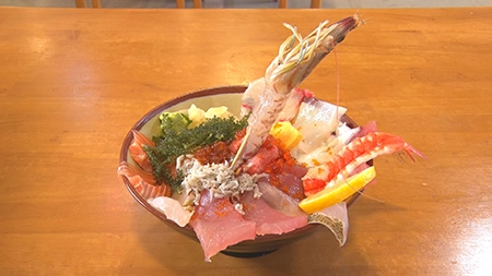 近海でとれた鮮魚を豪快に盛り付けた刺身定食や生きた車海老がそびえる海鮮丼を堪能できます。