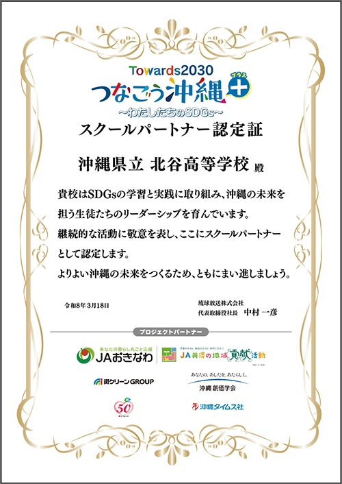 このようなSDGsの学習を継続的に取り組んでいる北谷高校の活動を称え、RBCからスクールパートナー認定証を贈呈しました。贈呈は2026年3月18日に沖縄県立北谷高等学校で行われたました。