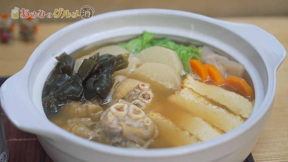 ④ おでん鍋にてびちの茹で汁・水・おでんの素を入れ
