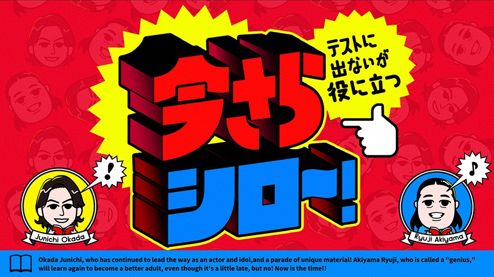 岡田准一&秋山竜次(ロバート)の仲良し2人が、テストには出ないけど人生の役に立つ情報を、時にはボケながら、時には真面目に、全力で体験しながら学ぶバラエティ。