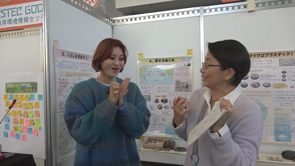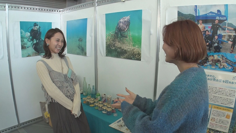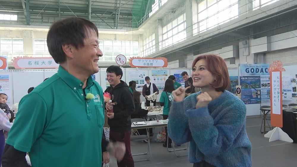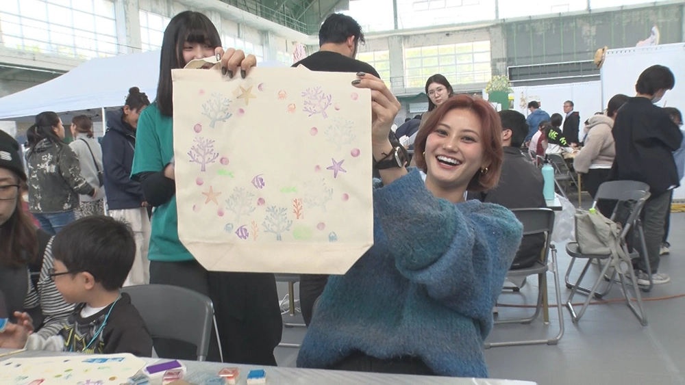 そこでは、澪花ちゃんがこれまでお世話になった方々との再会がありました。水中ゴミ拾い専門のダイビングショップ、Dr.blueの東さんは、「面白いごみを展示することで、興味のない人もごみ問題を考えるきっかけになってほしい。」自然学習講師や海洋観察ガイドを行っている“しかたに自然案内”の鹿谷さんは、「ごみを流さないなど、海の良い状態を極力保っていれば、100年後はきっとよくなる。」とのこと。そして、東京の池袋にある“サンシャイン水族館”もブースを展示。恩納村の養殖サンゴを水族館で育て、増やしたサンゴを沖縄の海へかえす“サンゴプロジェクト”が今年で20周年。会場では子どもたちにも人気のオリジナルエコバック作りも!水族館館長の田木さんは「沖縄県だけではなく多くの方々に恩納村の取りくみを知っていただき、ひとつでも貢献したい。」と仰ってくれました。