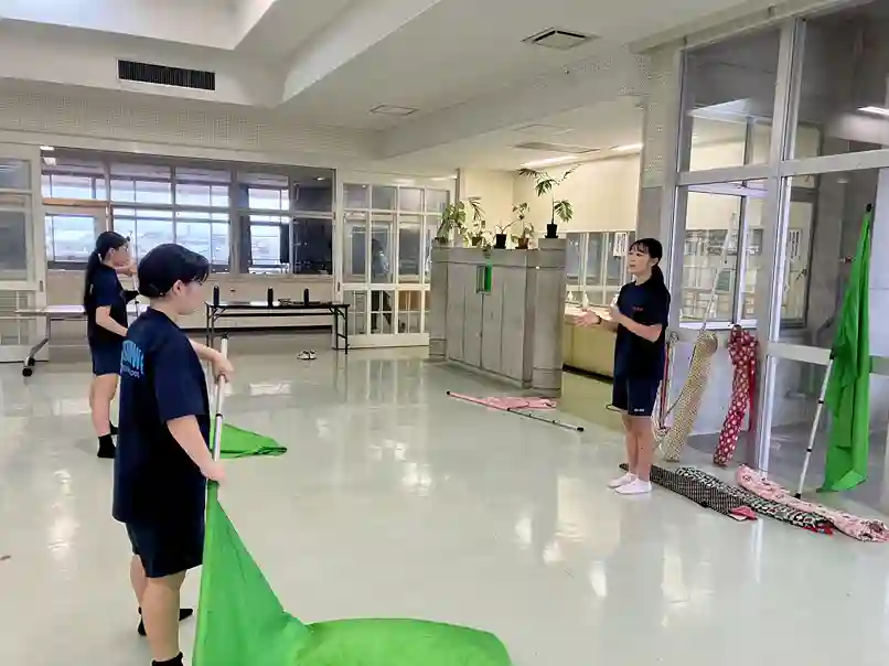 美優さんの手拍子に合わせて、緑色のフラッグを投げたり回したりするなどして練習しており、フラッグを動かすときの旗の音が合う瞬間が気持ちいいと感じました!