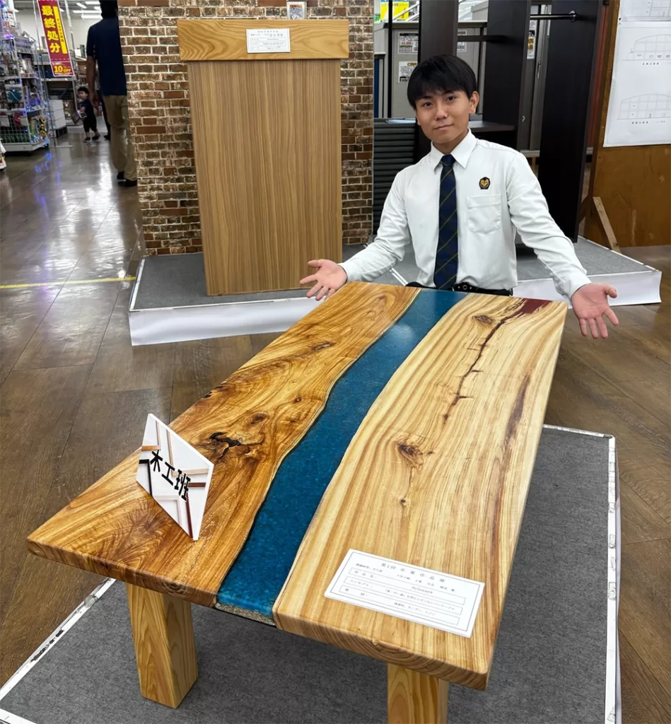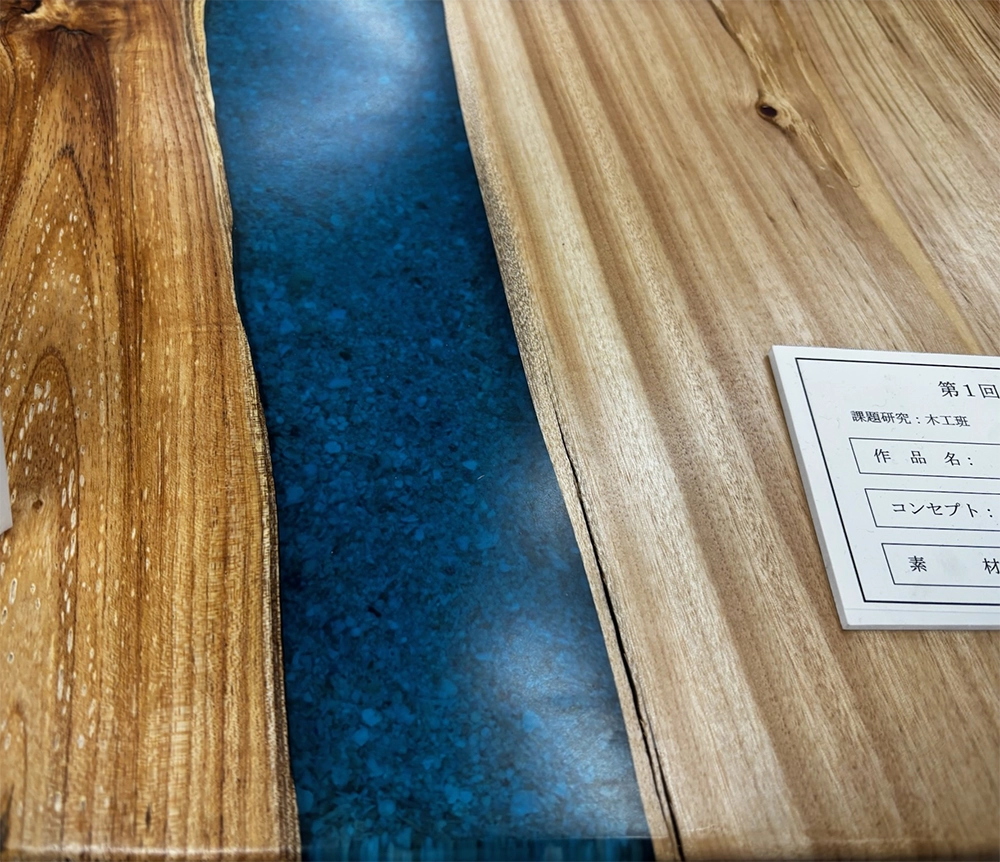浦添工業高校建築科の崎浜蓮さんは、3年間の集大成として、リュウキュウマツとレジンを組み合わせた座卓を制作しました。