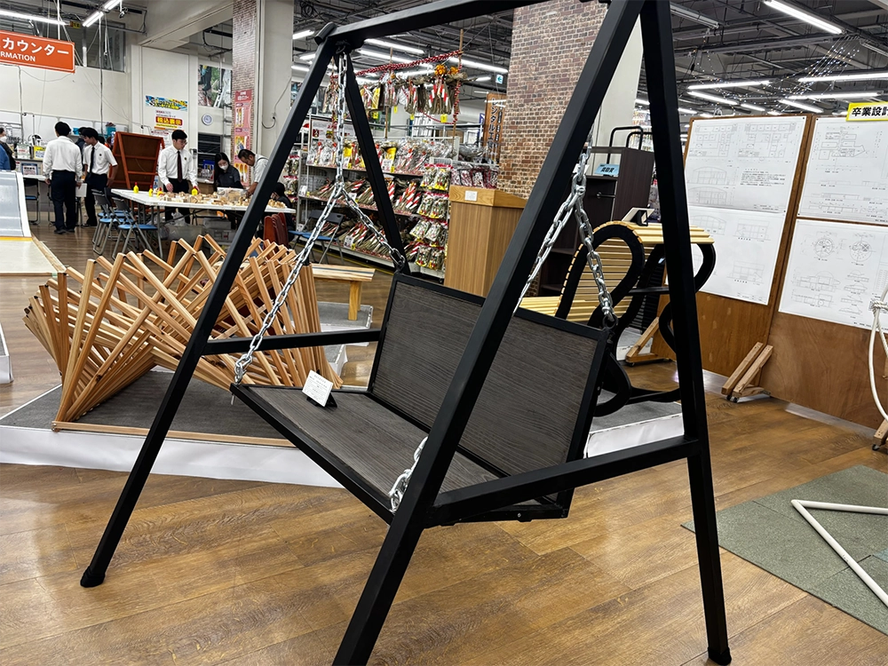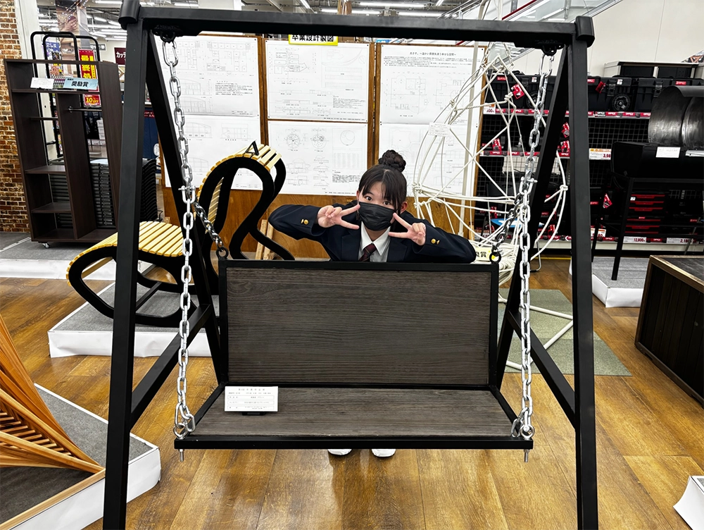 一級建築士の祖父や父の背中を追い、新設されたばかりの建築科へ。当初は難しい計算に挫折しそうになったこともありましたが、実習の楽しさや周囲の支えで乗り越えてきました。 完成した作品『帆風流 ブランコ』は、大好きな黒のカラースプレーと、一目惚れした美しい木材を組み合わせたシックなデザインが特徴です。